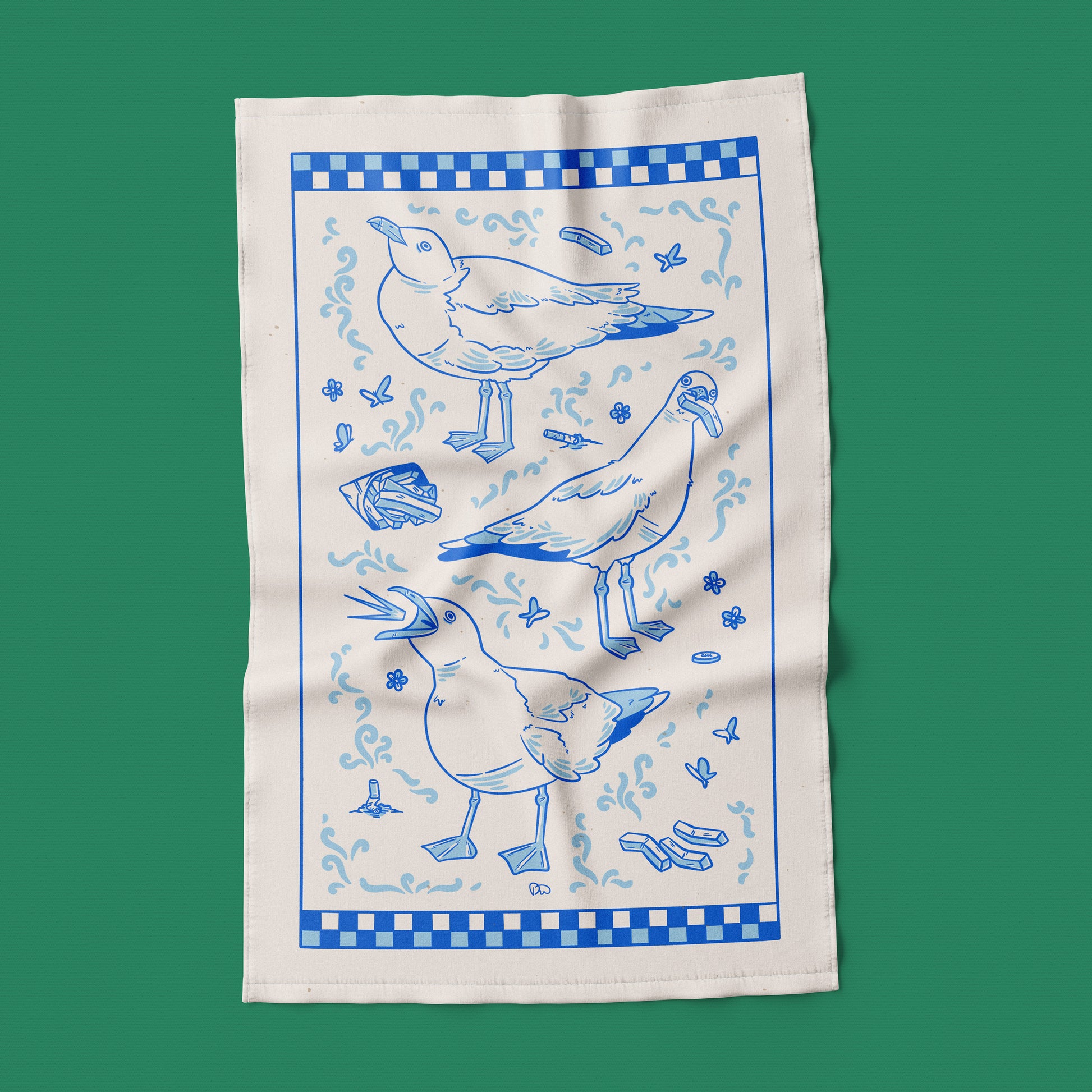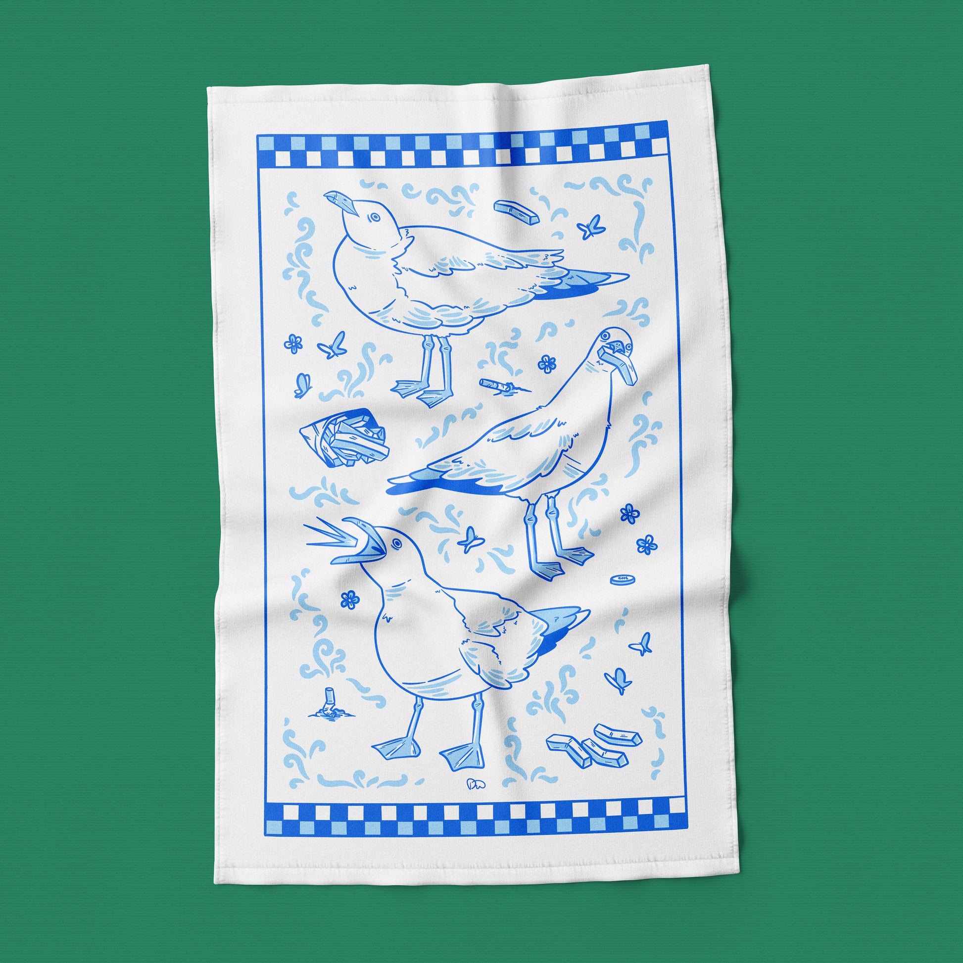 Printed on organic cotton, this tea towel is a playful homage to everyone’s favourite seaside rascals. Captured in all their chip-stealing, cigarette-butt snacking glory.